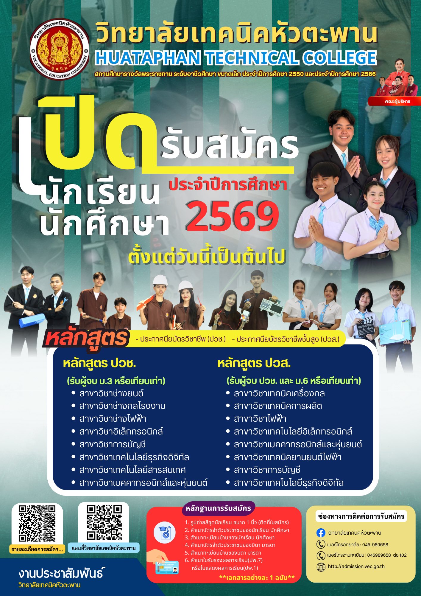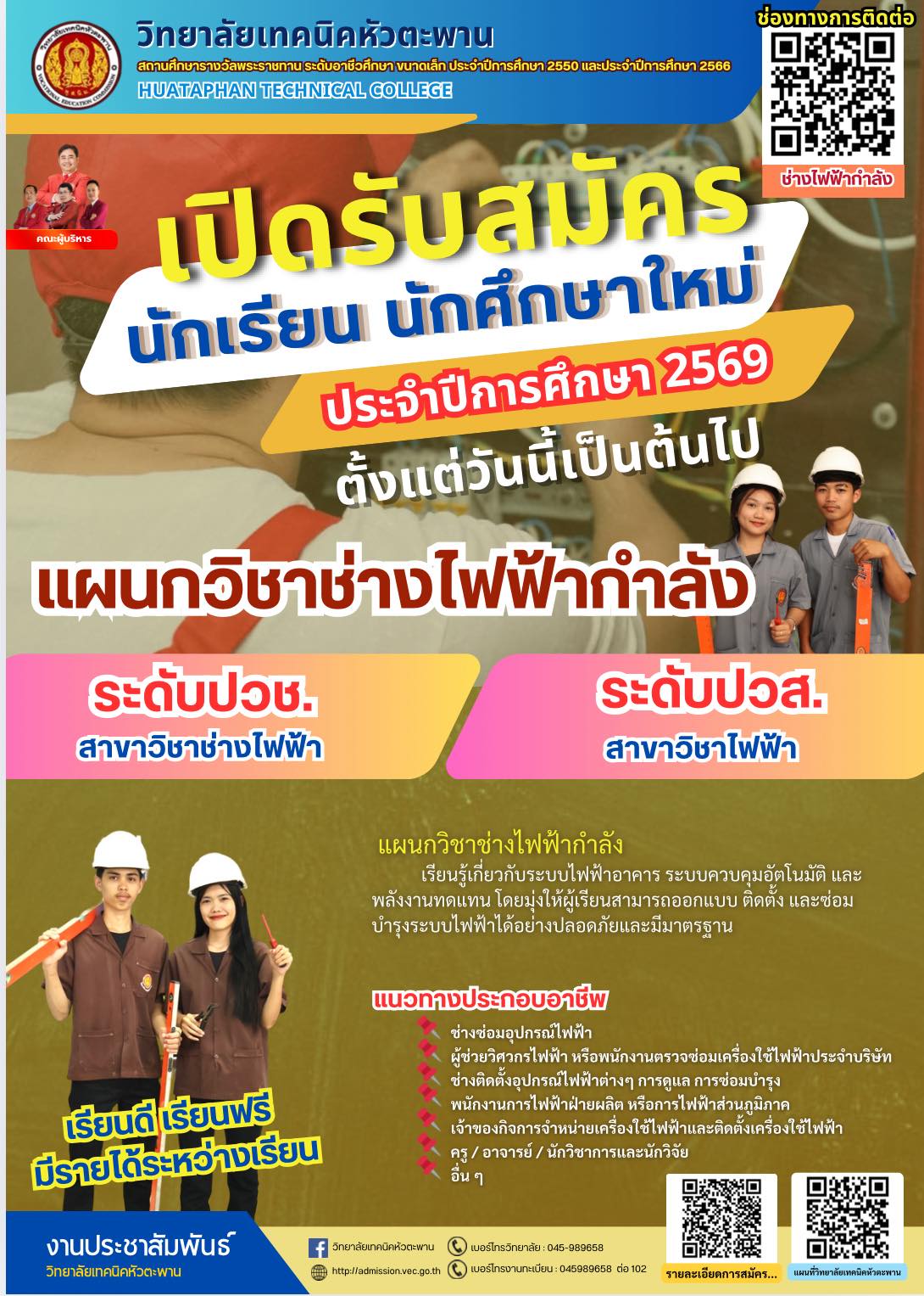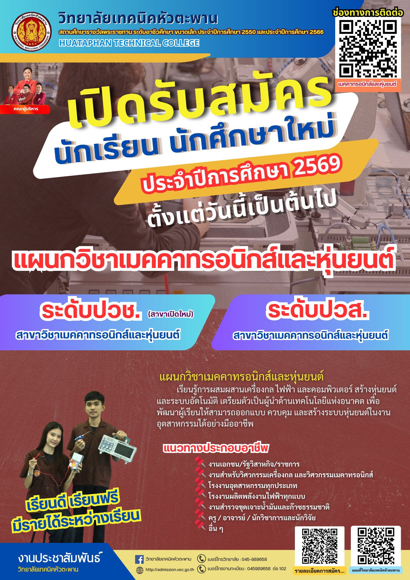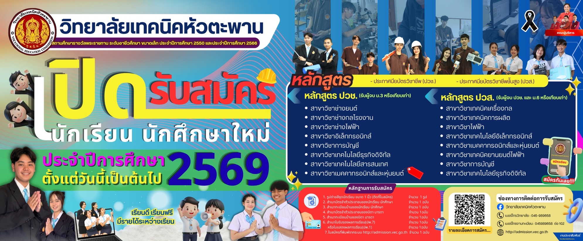 - ประกาศวิทยาลัยเทคนิคหัวตะพาน เรื่อง ขอเชิญชวนผู้ประกอบการร่วมเสนอรายละเอียด วัสดุโครงการยกระดับการจัดการศึกษาและเพิ่มสมรรถะผู้เรียนสายอาชีพ ประจำปีงบประมาณ 2569